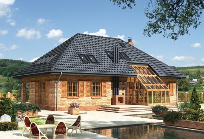 С двускатен покрив, прозорците са поставени на фронтона от двете страни за по-добър прием на студени въздушни маси и отстраняване на застояли такива.