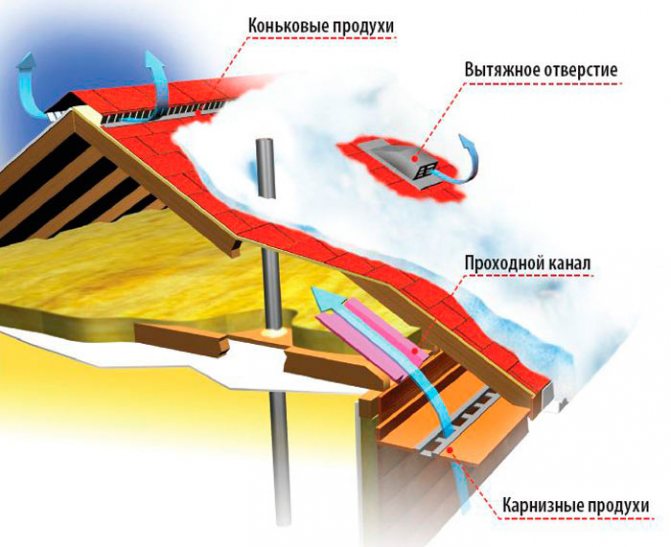 Добрата вентилация на таванското пространство е съществена стъпка при проектирането. Това е вентилационната система, която ви позволява да регулирате топлообмена на тавана и съответно в помещенията на къщата, тъй като покривът през летния период може да нагрее повече от 100 ° C. През студения сезон вентилацията предотвратява натрупването на влага и замръзването на гредите.