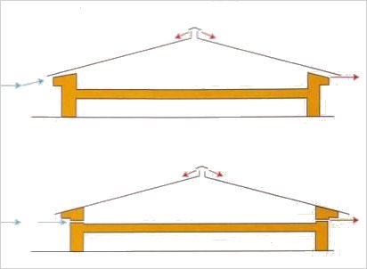 Ако ъгълът на наклона на покрива е 450 или повече, тогава стаята се проветрява поради разликата между външната и вътрешната температура.