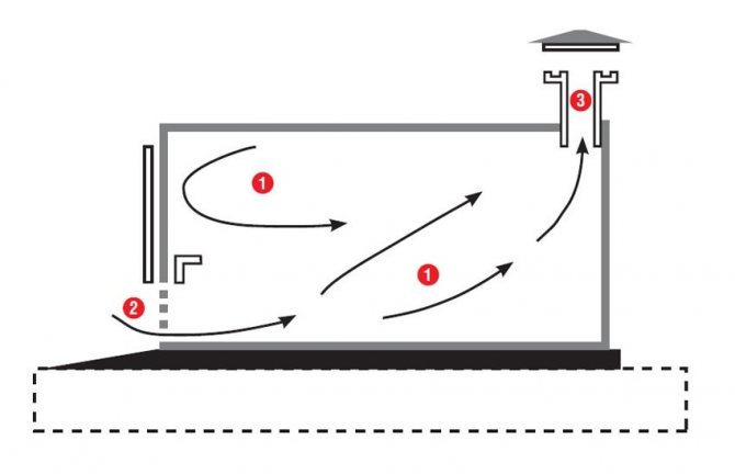 Най-простата вентилационна система (1 - движение на въздуха в гаража, 2 - отвори за всмукване на въздух, 3 - изход за въздух)
