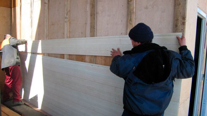 - Полагане на топло и хидроизолация. На етапа на топлоизолация плочите, избрани въз основа на топлотехнически изчисления, се фиксират с гъби или стикери, в зависимост от избрания материал. Полагането започва от долния ред и продължава отдолу нагоре.При извършване на двойна топлоизолация, след монтирането на изолацията се полага материал, който предпазва листовете от влага - този слой също е прикрепен с помощта на дискови дюбели.