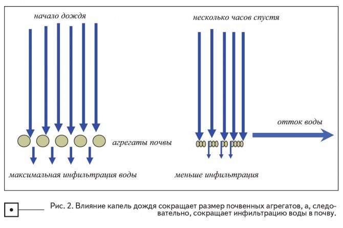 Какво наистина се случва, когато капка удари повърхността на почвата? Размерът на капчиците зависи от силата на гръмотевичната буря, която от своя страна е предопределена от климата на определен географски регион. Диаметърът на капчиците варира от 0,25 до 6 мм (средното е около 3 мм) и сега сравнете диаметъра на капката с диаметъра на почвените агрегати, в които тази капка попада, а почвата от своя страна не е покрити с каквото и да било; размерът на почвените агрегати обикновено е по-малък от 1 mm. Когато капчица с диаметър 3 mm, летяща със скорост 750 cm / s, се удари в сглобка с диаметър по-малка от 1 mm, повредите често са много значителни. Ако поставим това в относителна маса, то това явление е подобно на факта, че кола с тегло 80 кг се блъска в човек с тегло 1600 кг, движещ се със скорост 27 км / ч. Издуханият от вятъра дъжд, който ускорява скоростта на капката, води до по-голямо въздействие, тъй като капка, ускорена от вятъра, носи заряд на енергия 2,75 пъти повече от дъжда при спокойни условия. Съвсем очевидно е, че почвените агрегати ще бъдат унищожени, особено ако те са постоянно ударени от дъждовни капки по време на гръмотевични бури с каквато и да е продължителност. Енергията на дъждовните капки има отрицателен ефект върху структурата на почвената повърхност, буквално „експлодира“ почвените агрегати. Когато агрегатите експлодират, останалите малки частици запушват пространството на макропорите на почвата и скоростта на инфилтрация намалява (фиг. 2). Очевидно по време на кратка или лека гръмотевична буря ефектът от дъждовните капки ще бъде по-малък. No-till предлага решение на тази дилема, защото С тази технология растителните остатъци остават на повърхността, предпазвайки повърхността на почвата от въздействието на дъждовните капки.