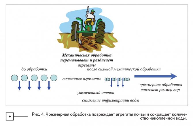 Агрегацията на почвата намалява с увеличаване на интензивността на обработката и / броя на годините на обработка (фиг. 4).Механичната обработка на почвата влияе отрицателно върху почвените инертни материали по две основни причини: 1) физическо раздробяване, което води до намаляване на размера на инертните материали; 2) увеличаване на нивата на окисление на органичните вещества, което се дължи на разрушаването на макроагрегатите и последващото откриване на органични съединения от почвените организми. Разпределението на размерите на инертните материали също се променя по такъв начин, че микропористостта се увеличава поради макропорьозност, което води до намаляване на степента на инфилтрация. Степента, до която механичната обработка на почвата влияе на инфилтрацията, се определя от сложното взаимодействие на вида на обработката, климата (особено валежите и температурата) и времето, заедно с характеристиките на почвата като структура, органична структура и съдържание на органични вещества. Следователно, продължителното обработване на всякаква почва намалява устойчивостта на инертните материали към физическо унищожаване, например излагане на дъждовни капки и механична обработка от всякакъв вид. Както глинестите минерали в почвата, така и органичните вещества обаче стабилизират почвените агрегати и ги правят устойчиви на физическо разрушаване. Намаляването на количеството органични вещества намалява стабилността на инертните материали, особено ако тя вече е ниска.