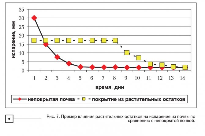 Нека да покажем как остатъците от растения, оставени на повърхността на почвата, влияят върху изпарението на водата от почвата. Очевидно те ще отразяват слънчевата енергия, охлаждайки повърхността на почвата, а също и вятъра; и двата ефекта ще намалят първоначалната скорост на изпаряване на водата (фиг. 6).
