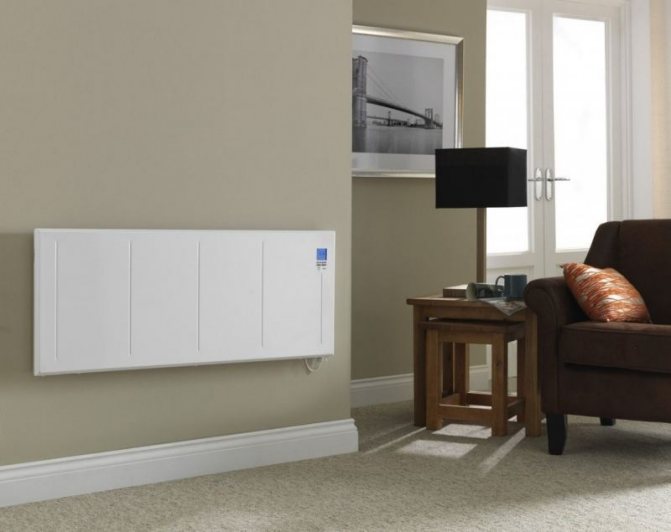 Стенните електрически радиатори са най-популярното отоплително оборудване. Те са компактни и икономични, ефективно отопляват помещенията. Мощността, необходима за отопление, е приблизително 800 W на 10 квадратни метра. м жилищна площ (с изключение на други фактори). Цените за електрически стенни отоплителни батерии, работещи на принципа на въздушната конвекция, започват от 1700 рубли за модел от 1 kW.