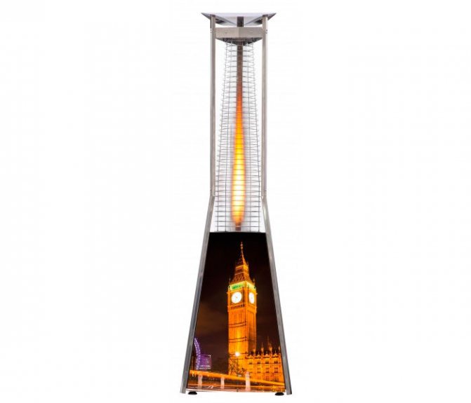 Както подсказва името, този нагревател е създаден в стила на пирамида, която има тясна, извисяваща се форма. Пламъкът гори в здрава колба, затворена с четири мрежи. От едната страна има шарнирен капак, който осигурява достъп до мястото за монтаж на цилиндъра, бутон за пиезо запалване и превключвател за регулиране.