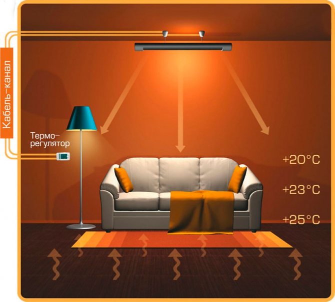 Характеристика на оборудването с инфрачервени лампи е, че излъчваната от тях топлинна енергия се пренася върху повърхностите на предмети или хора в стаята и не се абсорбира от въздуха. Това е основната разлика между такива устройства от конвенционалните електрически нагреватели. Нагряването на предмети се извършва само в областта на излагане на лампи. По този начин топлината се натрупва в твърди предмети, като стени, мебели, а след това се прехвърля в стаята и затопля въздуха.