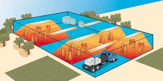 Традиционният метод за отопление на големи производствени площи води до значителни топлинни загуби. За да се установи оптималната температура в помещението, нагревателите трябва да затоплят целия обем въздух вътре. Тук трябва да се има предвид, че според законите на физиката топлата въздушна маса непрекъснато ще се издига нагоре, следователно, за да се постигне необходимата температура в работната зона на хората, ще трябва да се отделят повече топлинни ресурси изразходвани за отопление на работилница с високи тавани.