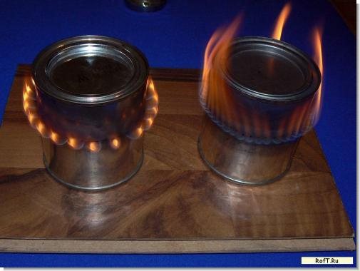 Принципът на неговото действие е прост: пламъкът загрява стените на кутията, топлината по стените се предава надолу към алкохола, алкохолът кипи по стените и налягането вътре се повишава, алкохолните пари излизат под налягане през дупки и, смесвайки се с въздуха, изгаря красиво. Сега поставяме тенджера, чайник, халба отгоре или просто се затопляме.