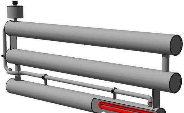 След като отдели топлина към тялото на устройството, кондензираната пара под формата на вода тече надолу към долната част, където е монтиран нагревателният елемент. Мощността на нагревателния елемент и обемът на водата са избрани по такъв начин, че да се изключи разкъсването на нагревателя чрез парно налягане.