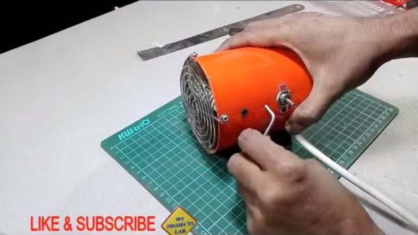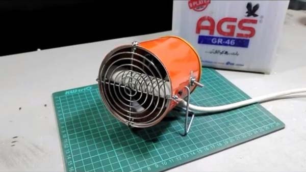 Този прост нагревател работи на принципа на топлинен пистолет, вентилаторът задвижва въздух върху нагрята намотка, което води до поток топъл въздух. Устройството работи от 12 V източник на захранване, може да бъде свързано към бордовата мрежа на автомобила или към 12 V батерия.