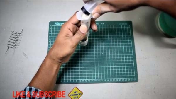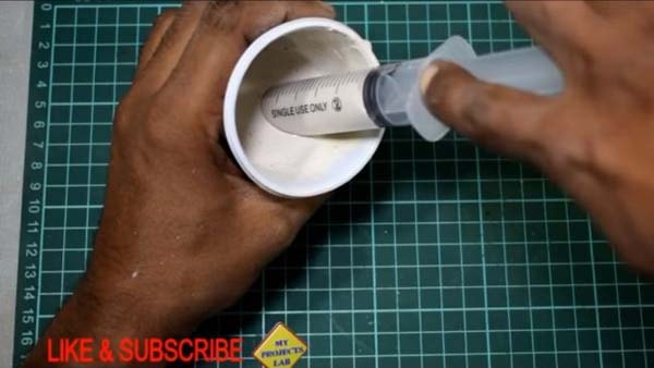 Сега трябва да направите основа, върху която ще се държи спиралата, тя е направена от гипс. Гипсът се смесва с вода до течна консистенция, ние събираме течен гипс в спринцовка.