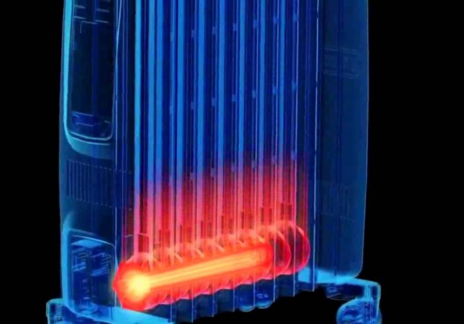 - тръбен електрически нагревател. Намира се в долната част на кутията. Изцяло покрит с масло при нормална работа. Нагрявайки този пълнител отдолу, нагревателният елемент стимулира появата на конвекционни потоци вътре в оборудването. В резултат на това устройството се загрява равномерно и еднакво равномерно отделя топлина в помещението;