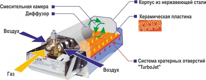 - втечнен газ навлиза в загрятата каталитична плоча, която под въздействието на всички фактори изгаря, без да образува пламък.