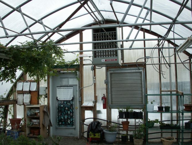- Оранжерия с термо отопление с вентилатор... Той загрява въздуха по-ефективно и равномерно, но го изсушава силно, което е много вредно за отглежданите растения. Освен това топлия въздух отгоре, влизайки в контакт със стъклото, бързо ще се охлади, така че разходите за експлоатация на този тип отопление ще бъдат доста високи.