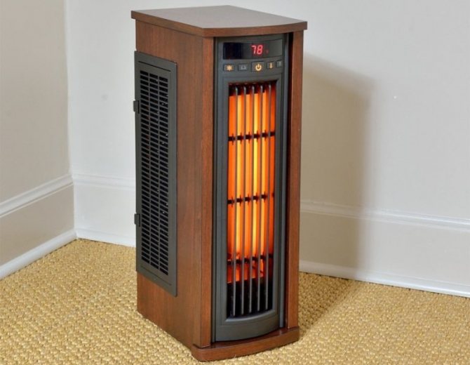 - Преносими инфрачервени отоплителни устройства на открито. Те могат да се носят навсякъде в стаята или дома. За разлика от предишните видове, подовите нагреватели заемат допълнително подово пространство. Изработени под формата на лампи или панели, те се окомплектоват със специални стойки под формата на стативи или крачета на стойката за стабилно положение. Почти всички подови уреди имат вградени сензори за аварийно изключване в случай на преобръщане. Но не всички подови модели са оборудвани с термостати.