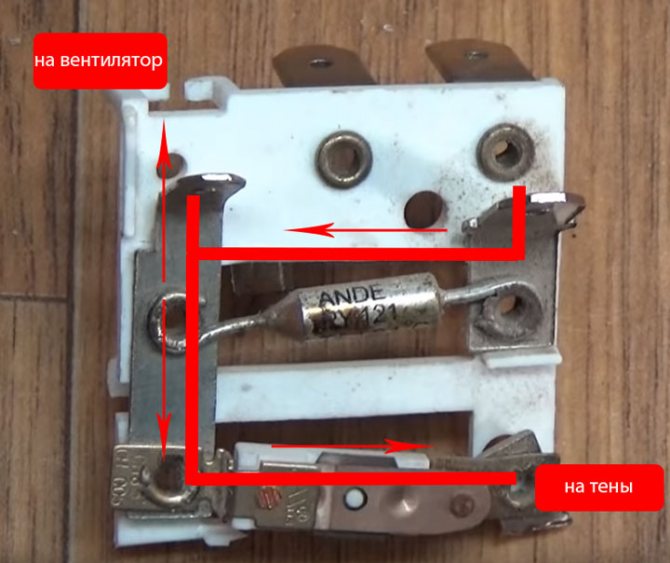 На обратната страна на тази двойна защита, на противоположните контакти на нагревателния елемент, окабеляването от превключвателя за режим е подходящо.