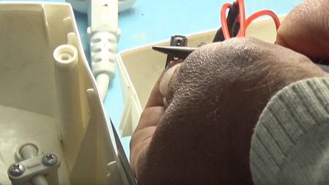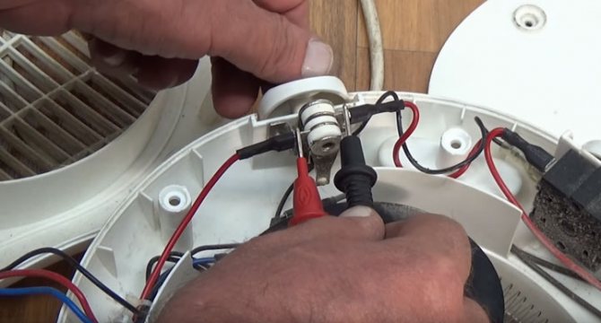 Превключете тестера в режим на набиране и със сондите една по една проверете целостта на захранващите проводници. За целта докоснете входните контакти във вентилатора и металните щифтове на щепсела.