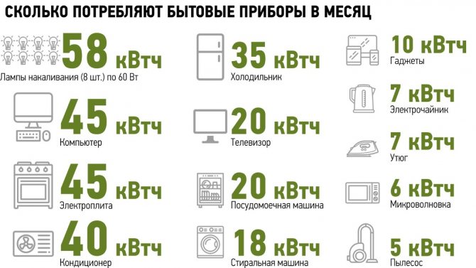 | Стандартният комплект уреди - осветление, хладилник, компютър, пералня, телевизор - консумират средно 180 kWh на месец. Ако в къщата има електрическа печка, консумацията се увеличава до 225 kWh. Ютия, сешоар и зарядни устройства за джаджи, които са незаменими, но те работят от време на време - това все още е около 20 kWh. Устройствата за комфорт - електрическа кана, ютия, микровълнова фурна, съдомиялна машина, прахосмукачка, климатик - ще увеличат разходите с около 80 kWh. Трудно е да се впишете в нормата, но е възможно - ако малко да вкарате комфорт. |