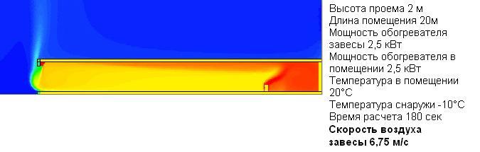 На фигурите по-горе условията са абсолютно същите, с изключение на скоростите на въздушния поток. Първоначалните скорости на въздушния поток на завесите се избират така, че в първия случай да се демонстрират какви са последиците от недостатъчната скорост на въздушния поток (стайната температура е близка до външната температура), за втория - оптималната скорост, а за третият - прекомерен. Сравнението на температурните условия на втората и третата фигура е от особен интерес. Въпреки че производителността (или скоростта на въздушния поток) на въздушната завеса се увеличава, стайната температура спада. По този начин, въпреки факта, че въздушната завеса, показана на третата фигура, е по-скъпа от въздушната завеса във втората (нейните характеристики са много по-добри), това води до големи топлинни загуби при отвора и съответно до по-лоши условия. Оптималният дебит на въздуха е показан на втората фигура. Припомнете си, че тази скорост е оптимална само за условията, показани на фигурата. Ако външната температура се повиши, дори тази скорост ще стане прекомерна по отношение на оптималната. Ако външната температура намалее, скоростта от 6,75 m / s вече няма да е достатъчна.
