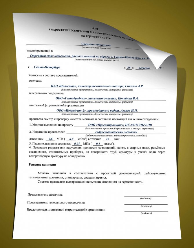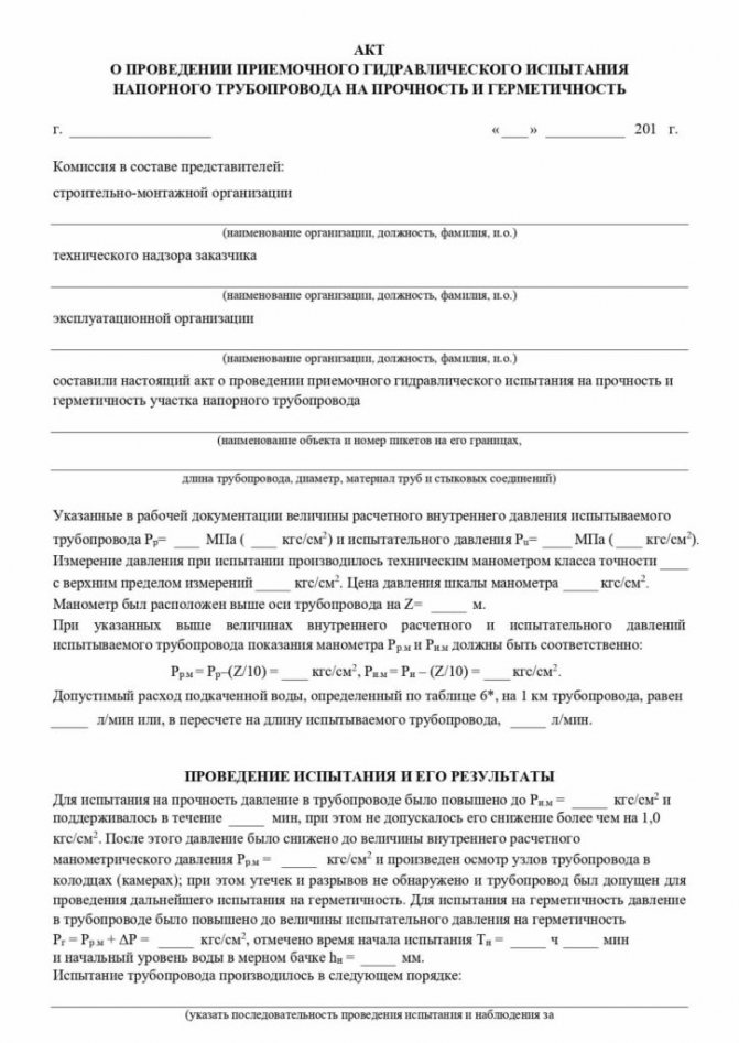 Формите на протокола за хидравлично изпитване могат леко да се различават от формите на пневматично изпитване под налягане. Когато го избирате, можете да се ръководи от SNiP 3.05.04-85