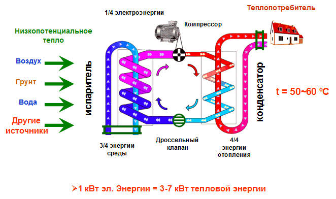 Делът на консумираната от компресора енергия може да бъде около 20%. Останалите 80% могат да бъдат заети от околната среда. Термопомпата може да приема енергия от атмосферата или от геотермални източници. Особеността на съвременните единици се различава по това, че те са конфигурирани не само за отопление, но и за охлаждане на помещението.