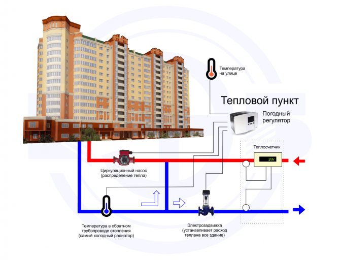 Топлоносителят от централната отоплителна система идва при вас в IPT, до контролния блок. След това охлаждащата течност влиза в отоплителната система на дома. След като е преминал през всички батерии, охлаждащата течност от всички щрангове се събира във връщащата тръба и отново влиза във вашия блок за управление. Контролерът за автоматизация анализира температурните параметри на улицата, захранващия тръбопровод (захранване), връщащия тръбопровод (връщане) и автоматично регулира разхода на охлаждаща течност, определяйки колко от охлаждащата течност и каква температура трябва да се подава към отоплителната система на къщата, според към вградените PID коефициенти. PID коефициентите се коригират от сервизните инженери при настройка на системата.