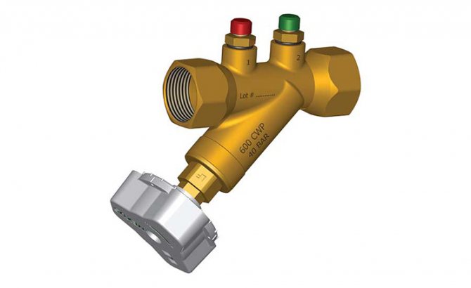 - Автоматично... На връщащия тръбопровод се инсталират автоматични устройства заедно с клапани на партньори, които могат да ограничат потока на средата чрез предварително задаване на производителността. Когато са свързани, те са свързани с партньори чрез импулсна тръба, която се свързва с вградения тест нипел. Ако вентилът е монтиран за подаване на вода по права линия, дръжката му е червена, когато е монтирана в обратната линия, тя е синя (модели Danfoss). Автоматичните типове са модели, контролирани от серво задвижване, което се захранва с постоянно напрежение.