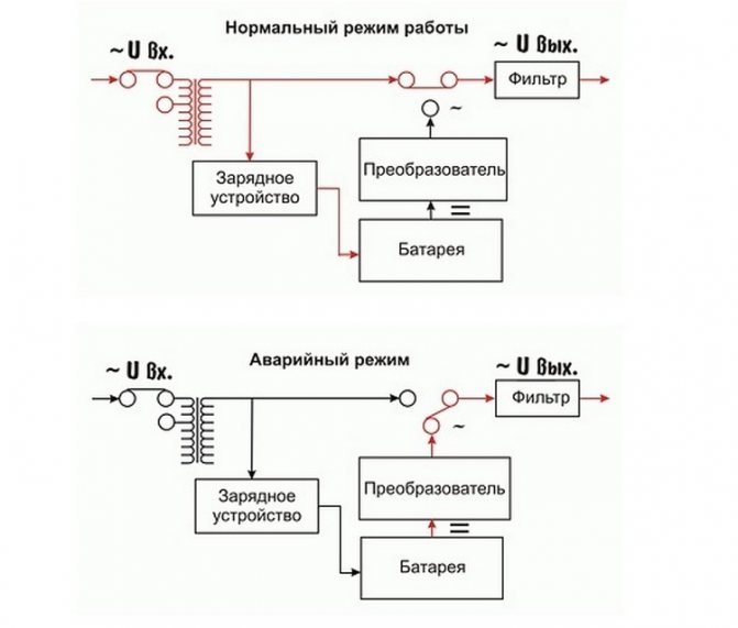 В случай на прекъсване на електрозахранването, параметри, надвишаващи стойностите на диапазона превключвателят свързва стандартната батерия за 4–12 ms. Постоянното напрежение на батерията първо се подава към електрическия преобразувател, където става променливо и след това се повишава до необходимото 220 V.