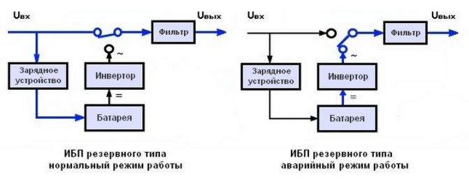 - Резервен UPS. Различава се с повишена ефективност, практически не вдига шум и не се загрява, е евтино, но в същото време отнема много време при превключване и изкривява формата на изходното напрежение. В такива устройства не е възможно да се коригира амплитудата и честотата на тока.