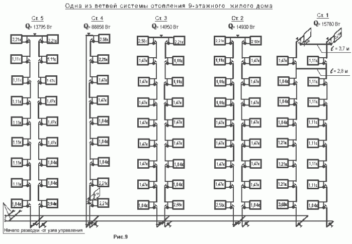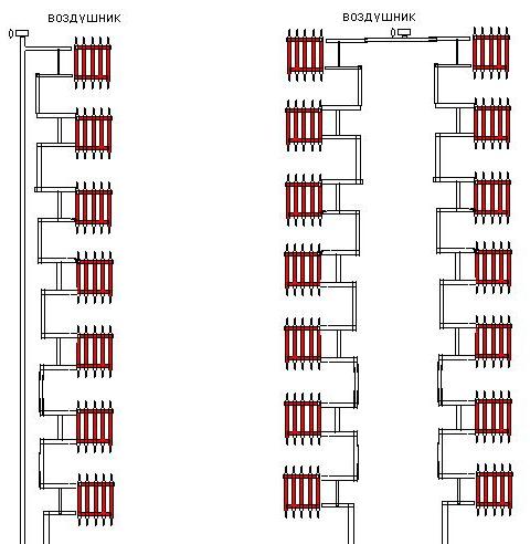 Отоплителното устройство в девететажна сграда, построена от съветски съюз, често е малко по-различно: пълнителят е поставен на тавана. Там е монтиран и разширителен резервоар с клапан за обезвъздушаване; на същото място - един от двойка клапани, отрязващи всеки щранг.