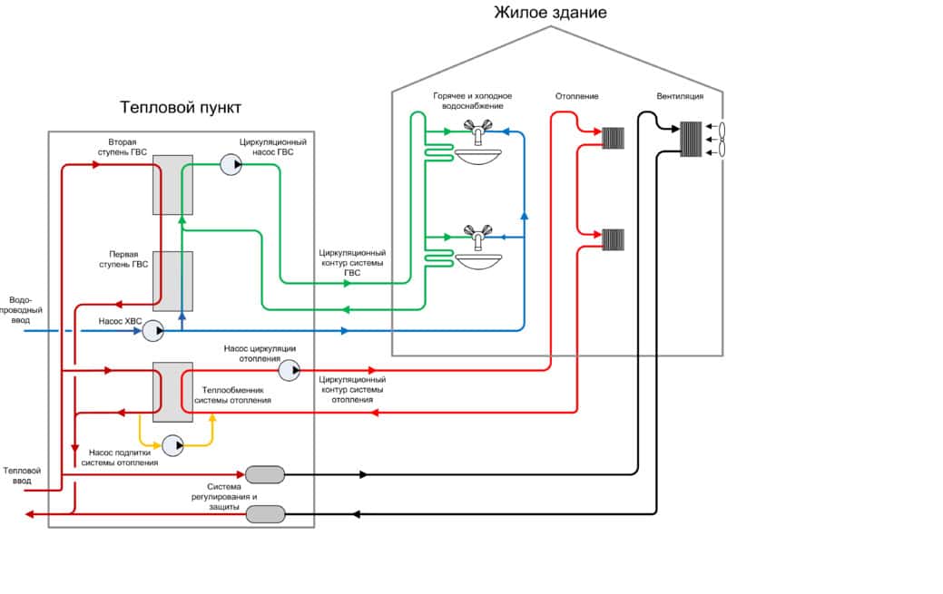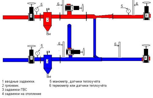 Отоплителната система на жилищните сгради започва с входните клапани, които отрязват къщата от магистралата.По техния фланец, най-близо до външната стена, преминава разделянето на зоните на отговорност на жителите на жилищата и отоплителните инженери.