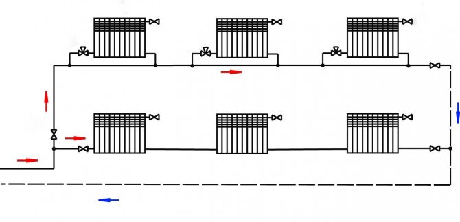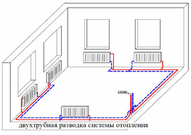 За двутръбна схема много "проблеми" са незначителни, тъй като захранващата и връщащата тръба работят отделно в нея и между тях са инсталирани радиатори.