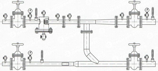 - Връзки за БГВ в захранващите и връщащите тръбопроводи. Изпълнението може да бъде различно: всеки тръбопровод може да има една или две връзки; във втория случай между входовете е монтиран фланец със задържаща шайба, създавайки разлика в налягането, за да се осигури непрекъсната циркулация. Това е необходимо, за да може горещата вода в щранговете за гореща вода да е гореща денонощно, а релсите за отопляеми кърпи, доставяни от захранването с топла топлина, да останат горещи.