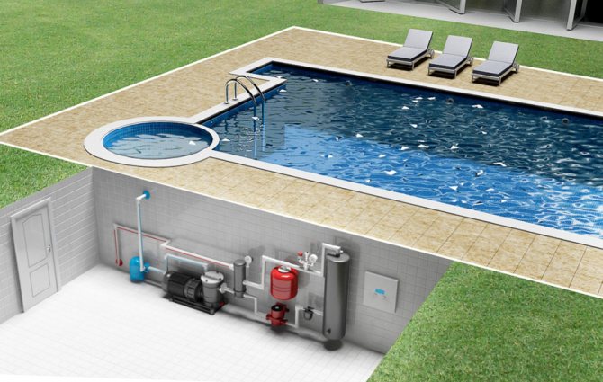 За нормалното функциониране на басейна, освен циркулационната система, определено са необходими още две системи. Първото е „сърцето“ на басейна - системата за филтриране. Осигурява се от инсталация, чийто филтриращ елемент е кварцов пясък или патрон. Елементите за филтрация могат да бъдат шарнирно. За почистване на филтъра има режим за обратно измиване, който се активира или ръчно (поне веднъж седмично, или както е указано от манометър) или автоматично. Обратното измиване отнема само 3-4 минути.