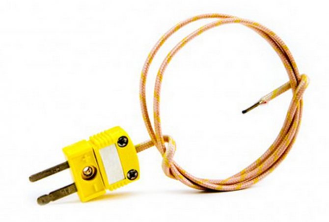 Това е термодвойка (плоча или пръчка), изградена от проводници, които се свързват към клемите на чувствителния елемент.