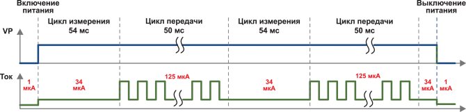 След включване LMT01 започва цикъл на измерване, който отнема до 54 ms (Фигура 5). През това време на изхода на сензора се образува ток с ниско ниво от 28 ... 39 μA. Това е последвано от цикъл на предаване на резултата от измерването под формата на токови импулси с амплитуда 112 ... 143 μA. Приемащият микроконтролер трябва да брои тези импулси, например с помощта на вградения брояч / таймер. Тъй като честотата на сигналите е около 82 ... 94 kHz, тогава с максималния брой импулси (4095), продължителността на предаване може да достигне 50 ms.