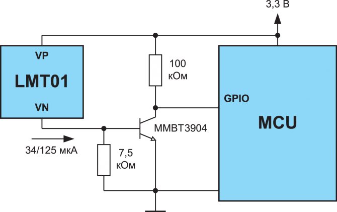 Помислете за устройство с захранващо напрежение Vdd = 3,3 V. Ако вземем минимално допустимия спад през сензора, равен на 2,15 V по време на цикъла на измерване, тогава през резистора ще се наблюдава сигнал от не повече от 1,15 V. За повечето цифрови контролери, логическата единица е 0, 7 ∙ Vdd, което за нашия случай ще бъде 2,31 V. В резултат на това използването на обикновен резистор се оказва невъзможно, тъй като микроконтролерът просто няма да „види“ сигнала на логическа единица. Изходът от тази ситуация може да бъде използването на микроконтролер с вграден компаратор или схеми за преобразуване на ниво.