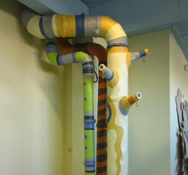 Най-лесният начин е да "разтворите" грозна тръба в пространството с помощта на бои и четка, боядисвайки щранг, за да съответства на стените. В някои случаи е подходящо да се боядисва в цвета на радиаторите, например, ако са направени в ретро стил и представляват имитация на антични батерии със сребърно покритие или позлата. За да не цапате тавана и да скриете небрежната граница на оцветяването, препоръчително е да поставите върху съединението пластмасов пръстен, изобретен за опънати тавани.