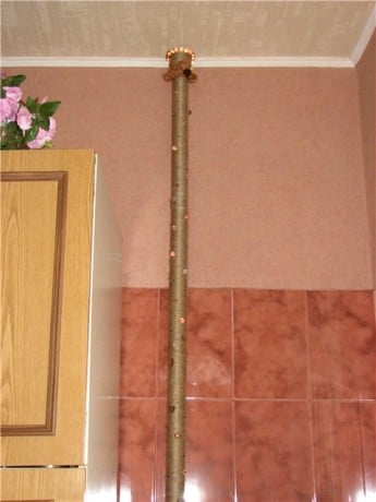 Не се препоръчва да покриете тръбата с винилов филм, но първо можете да направите рамка от ролки от тоалетна хартия и след това да скриете картона под филм с красив модел. Можете също да боядисате хартията в необичаен цвят, дори и да не ви харесва, да се отървете от ярко петно ще бъде по-лесно, отколкото да пребоядисате метална тръба.