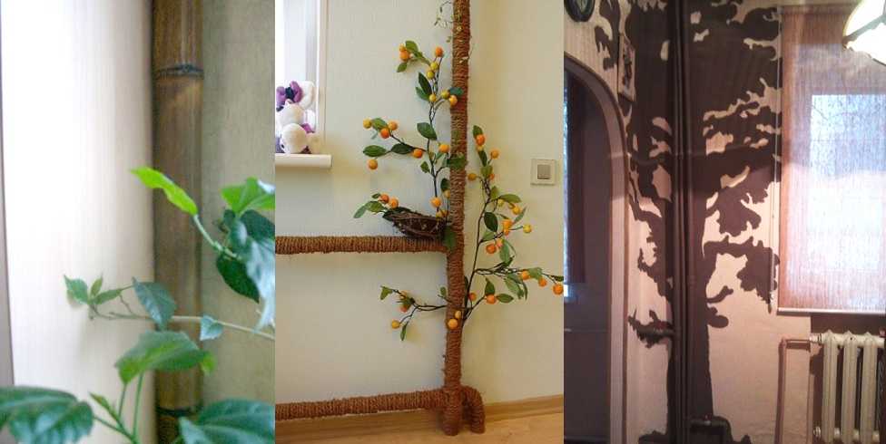 Щранг, скрит в бамбуков багажник, ще изглежда много стилен. За да направите това, багажникът се нарязва на дължина, вътрешните прегради се отстраняват и секциите се смилат. Детайлите се поставят върху щранга и след това се изтеглят на няколко места с въже с подходящ цвят. Тази идея може да се използва не само за дом в японски стил, но и в други екологични насоки. Препоръчва се стаята да се украси с няколко бамбукови пръчки като разсейване.