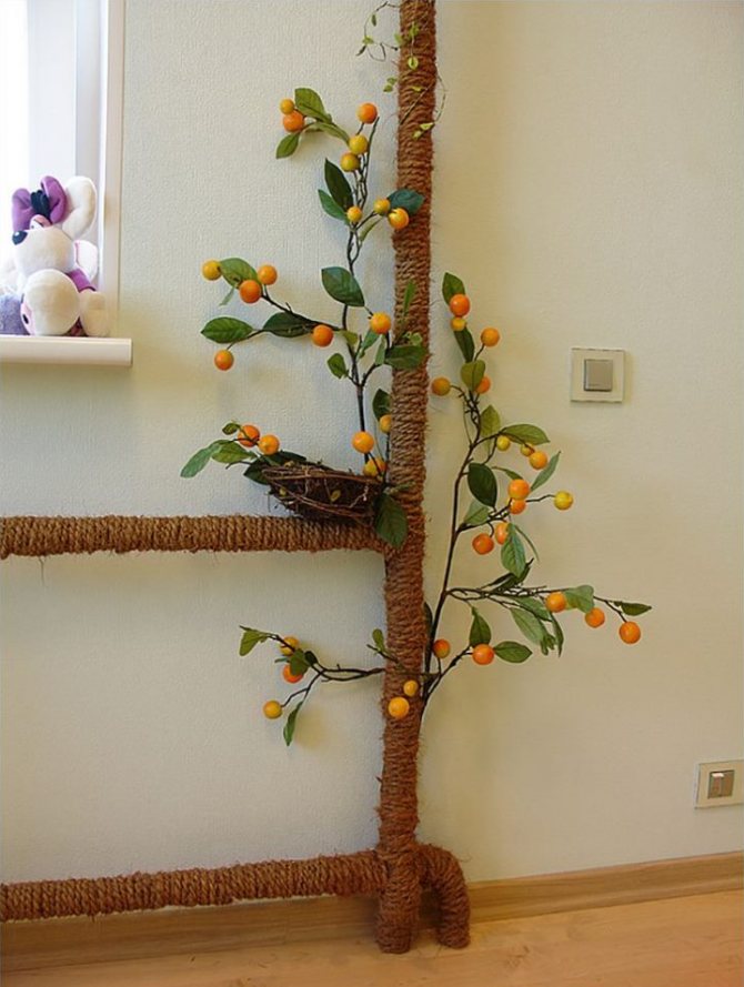 Ако не обичате да работите с бои, можете да използвате въже за украса. Първо тръбата се увива с юта или канап и след това се украсява с подходящи детайли. Това могат да бъдат шишарки, черупки, морски камъчета, детски играчки, колекция от значки, изкуствени плодове и цветя. Ако е необходимо, долната част може лесно да се превърне в котешка драскачка, като преди това е увеличила диаметъра си с помощта на картонена тръба.
