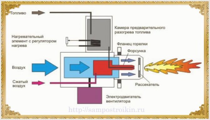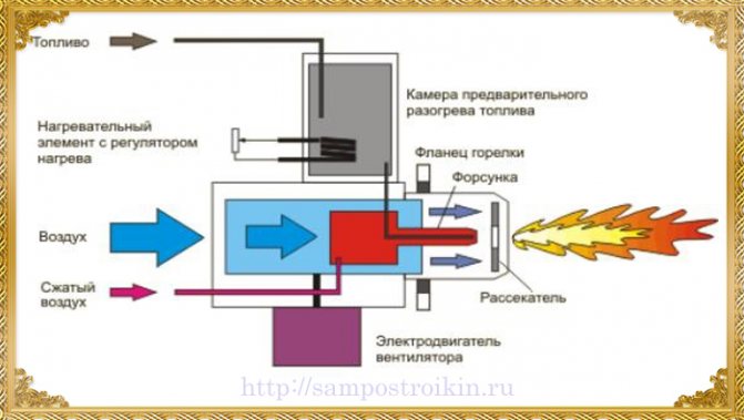 Нека да разгледаме набързо как работи горелката. От резервоара дизелът се подава към горелката. За да се осигури подаването на гориво, се използва специална помпа, която е снабдена с връщащ тръбопровод, който е необходим за циркулацията на горивото между помпата и резервоара.В този случай горелката използва толкова гориво, колкото е необходимо, а останките се връщат обратно в резервоара. Но преди дизелът да го достигне, той трябва да премине през филтъра и нагревателния елемент. На първия етап се отстраняват механични елементи, на втория горивото се загрява до оптималната температура.