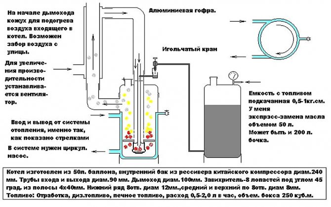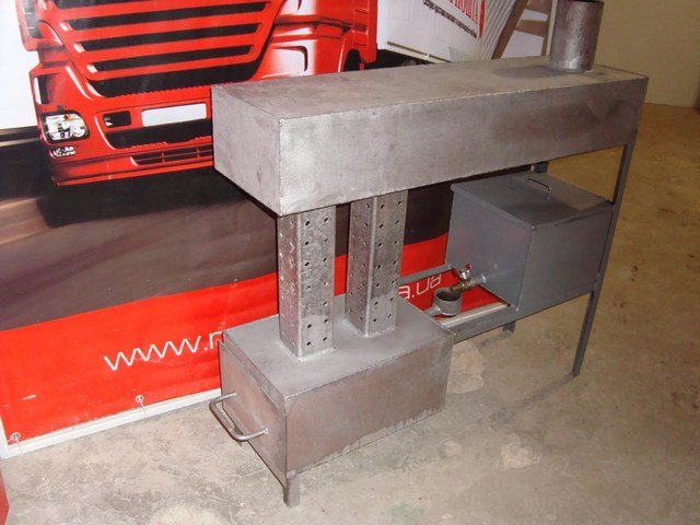 Самостоятелно изработеното устройство може да има компактни размери и да има високо ниво на безопасност. Това е много икономично: горивната смес и горимите съединения изгарят напълно. Ще ви трябват метални листове с дебелина 5 mm или повече. Тръбата има 2 колена, вложени един в друг и е разположена далеч от вратата. Долният контейнер служи като горивна камера и в същото време като резервоар за гориво; има отвор за зареждане с гориво. Средно такова устройство съдържа около 2–12 литра дизелово гориво.