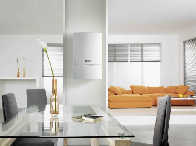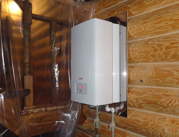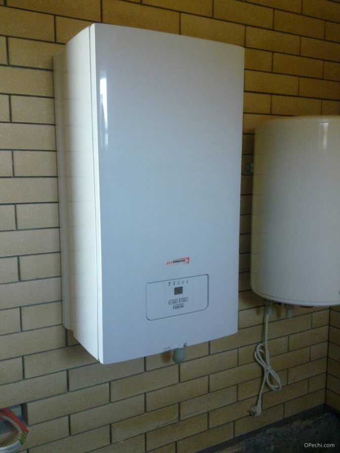 - Уредът не заема много място, не се нуждае от отделен изход за продуктите от горенето, има достатъчно мощност за отопление на голяма площ + генериране на енергия за нагряване на вода.