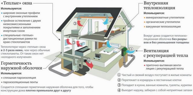 Принципите на енергийно ефективния дом не позволяват конвенционална вентилация; вентилацията също трябва да бъде енергийно ефективна. За тази цел са инсталирани въздушни рекуператори. Това са такива устройства, чрез които въздухът циркулира между помещението и улицата, докато отработеният въздух отделя топлината си към входящия. Нагретият чист въздух, който съдържа много кислород, влиза в къщата. Топлообменът между потоците се извършва в специален блок, конфигурацията му може да бъде различна.