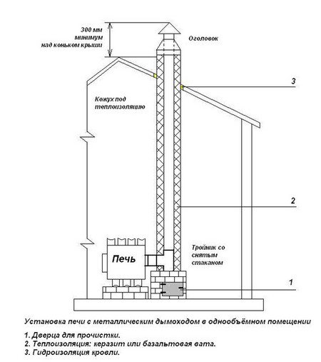 Правилно е да поставите горивната камера върху тухлена възглавница, положена в три реда, особено ако тя няма багажник. Над печката е монтиран комин, изработен от листов материал или чугун. За да се избегне пожар, е необходимо да се покрие тръбата с топлоизолация в точките на контакт с тавана и покрива. В зависимост от модела, такава фурна загрява площ от 15 до 90 квадратни метра. м. Можете да го инсталирате за един ден, ако не използвате декоративни облицовки.