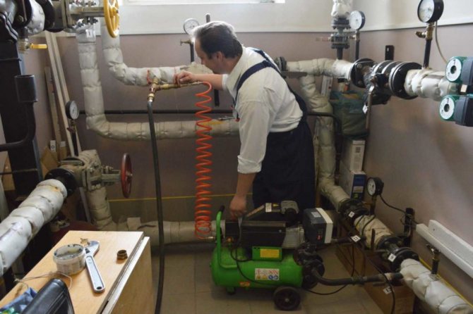 Основната същност на хидропеневматичното промиване на отоплителната система е почистване на тръбопроводната система и отоплителните радиатори с налягане на сгъстен въздух... В този случай охлаждащата течност остава в системата, тоест вода. Началото на този процес драстично увеличава скоростта на движение на течността в системата, а сгъстеният въздух придава на водата повишена турбулентност, тоест неравномерно движение и образуване на вихри. От действието на смес от въздух и вода, котлен камък и отлагания, образувани на вътрешната повърхност на системата, се разхлабват, отвеждат се от потока вода-въздух и се отстраняват от тръбите и радиаторите до точката на изпускане.