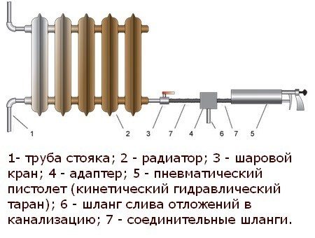 Схема на използване на хидродинамичния метод за почистване на отоплителната система. Щракнете за уголемяване.
