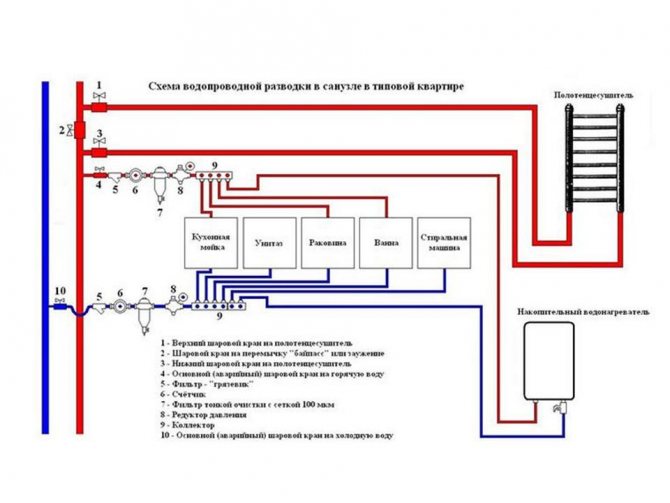 С колекторно окабеляване е инсталиран разпределителен блок, който разпределя водните потоци и насочва водата към определена точка на приемане на вода. Предимството на този метод е еднаквото налягане в цялата водоснабдителна система, недостатъкът е създаването на отделен клон за всеки потребител (това ще увеличи количеството консумативи).